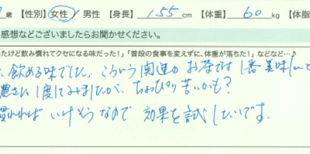 何をやっても痩せなくなった時に出会ったのが、からだ楽痩茶です。今はちょうど良いところで維持できていて、1日を通して飲んでます。これからも続けていこうと思っています。